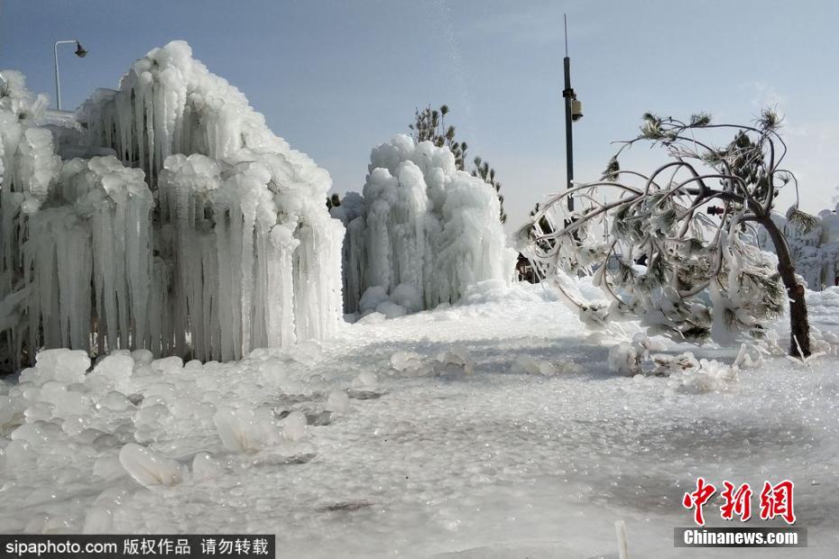 当地时间1月29日,土库曼斯坦,列巴普州气温陡降至-15℃,浇水的管线被冻裂,溢出的水形成独特冰挂景观,吸引人们观赏拍照。余柯 摄 图片来源:Sipaphoto