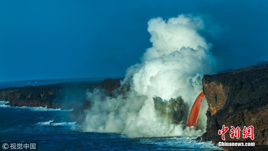 2018年1月30日讯(具体拍摄时间不详),夏威夷基拉韦厄火山位于海边的一段悬崖倾塌,岩浆从悬崖直直泻入大海,仿佛打开了地狱的“火龙头”。勇敢的摄影师Dhilung Kirat拍下了一系列震撼的画面。岩浆从悬崖一侧的一个洞口处涌出,形成一股被称为“firehose”的红色岩浆流,飞流直下300米泻入海中。炽热的岩浆冲击到冰冷水面上发生反应,溅起大量火山碎片。图片来源:视觉中国