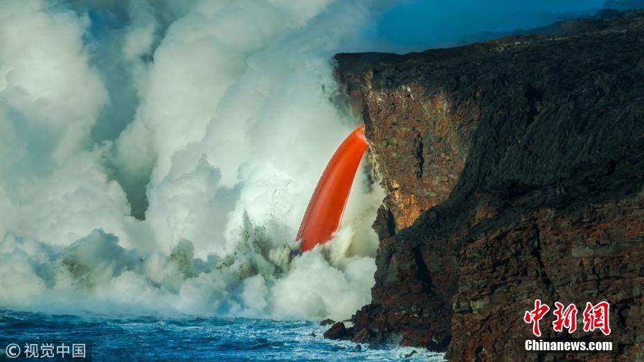 2018年1月30日讯(具体拍摄时间不详),夏威夷基拉韦厄火山位于海边的一段悬崖倾塌,岩浆从悬崖直直泻入大海,仿佛打开了地狱的“火龙头”。勇敢的摄影师Dhilung Kirat拍下了一系列震撼的画面。岩浆从悬崖一侧的一个洞口处涌出,形成一股被称为“firehose”的红色岩浆流,飞流直下300米泻入海中。炽热的岩浆冲击到冰冷水面上发生反应,溅起大量火山碎片。图片来源:视觉中国