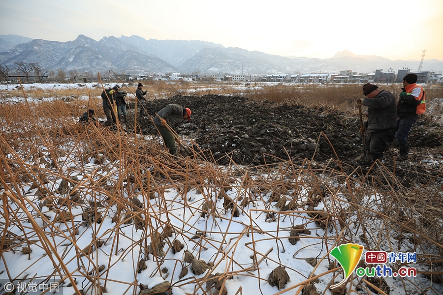冰天雪地挖藕人荷塘“掘金”一天挖150公斤鲜莲藕