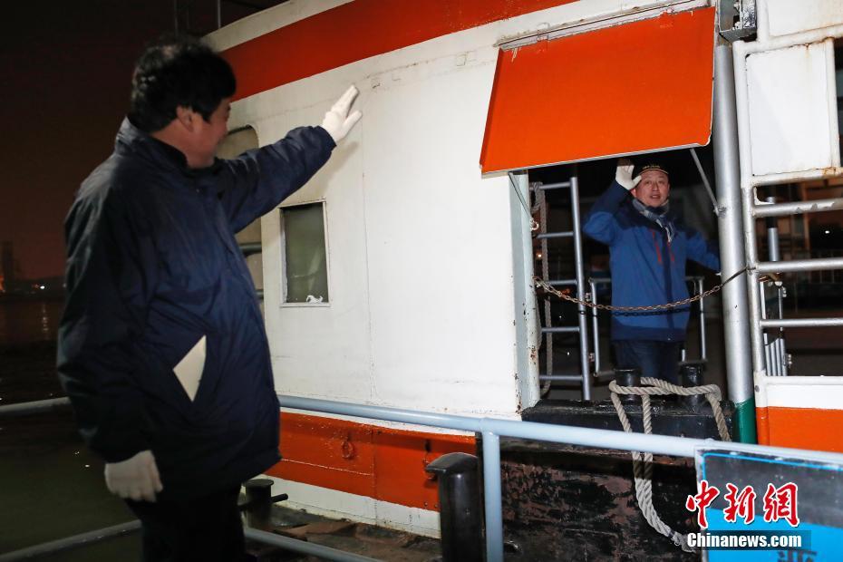 图为最后一条非空调普通轮渡结束了运营,工作人员相互再见。