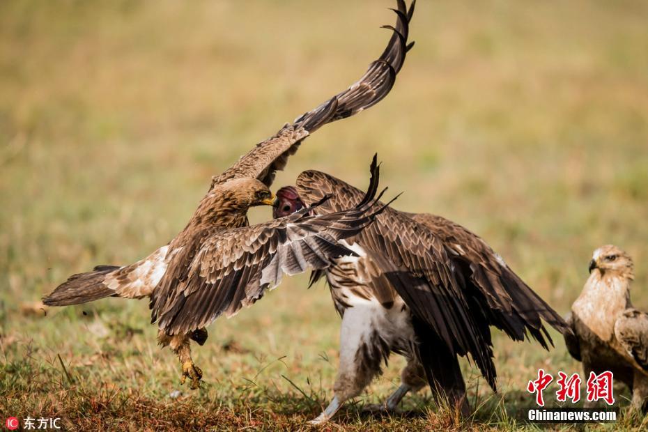 2018年2月1日报道(具体拍摄时间不详),非洲马赛马拉国家保护区,秃鹫和鹰陷入了激烈的打斗,上演着一场争食大战。双方拳脚相加,你一拳我一脚进行着殊死搏斗,为的是从被狮子杀死的角马之中获得一点残肉。坦桑尼亚44岁的野生动物摄影师Prakash Singh拍摄下了这组激战的照片。图片来源:东方IC 版权作品 请勿转载