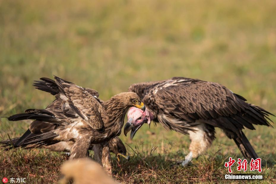 2018年2月1日报道(具体拍摄时间不详),非洲马赛马拉国家保护区,秃鹫和鹰陷入了激烈的打斗,上演着一场争食大战。双方拳脚相加,你一拳我一脚进行着殊死搏斗,为的是从被狮子杀死的角马之中获得一点残肉。坦桑尼亚44岁的野生动物摄影师Prakash Singh拍摄下了这组激战的照片。图片来源:东方IC