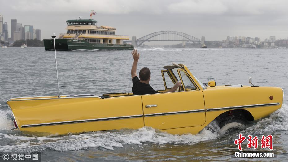 当地时间2018年2月2日,澳大利亚悉尼,戈斯福德老爷车博物馆最近收藏的一部水陆两用老爷车在悉尼港“劈波斩浪”。图片来源:视觉中国
