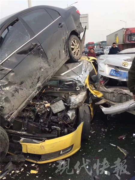 当天上午,知情人告诉记者,近11点他赶到现场时,交通已经恢复正常。追尾的六七辆车中,有一辆大巴车,受损很轻,车上人员没受伤;另一辆工程车受损也较小。不过,另外四五辆轿车受损较重,引擎盖等部件严重变形。一辆轿车因追尾," 骑 " 到两辆出租车上面,不少汽车零部件散落在地上。