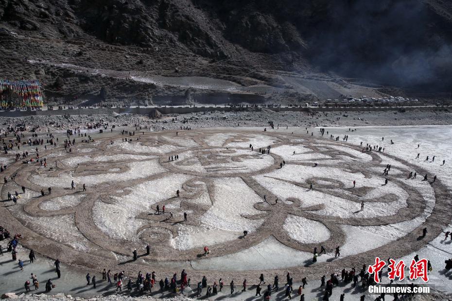 2月2日,在青海省玉树藏族自治州称多县海拔3600多米的通天河冰面上,当地藏族民众“沙为墨冰为纸”,“绘”写藏传佛教“六字真言”及“吉祥八宝”图案冰沙玛尼,以此祈福新的一年世界和平、五谷丰登、六畜兴旺。图为当地藏族民众制作的冰沙玛尼。中新社记者 罗云鹏 摄