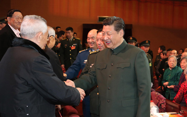 下午4时许,习近平来到老同志中间,全场响起热烈掌声。习近平同大家亲切握手,关切询问他们的身体和生活情况,共同回顾党的十八大以来党、国家、军队事业取得的历史性成就、发生的历史性变革。老同志们很振奋,一致表示要更加紧密地团结在以习近平同志为核心的党中央周围,全面深入贯彻党的十九大精神,以习近平新时代中国特色社会主义思想为指导,贯彻习近平强军思想,牢固树立“四个意识”,自觉坚定“三个维护”,满怀信心迎接强国强军新时代。
