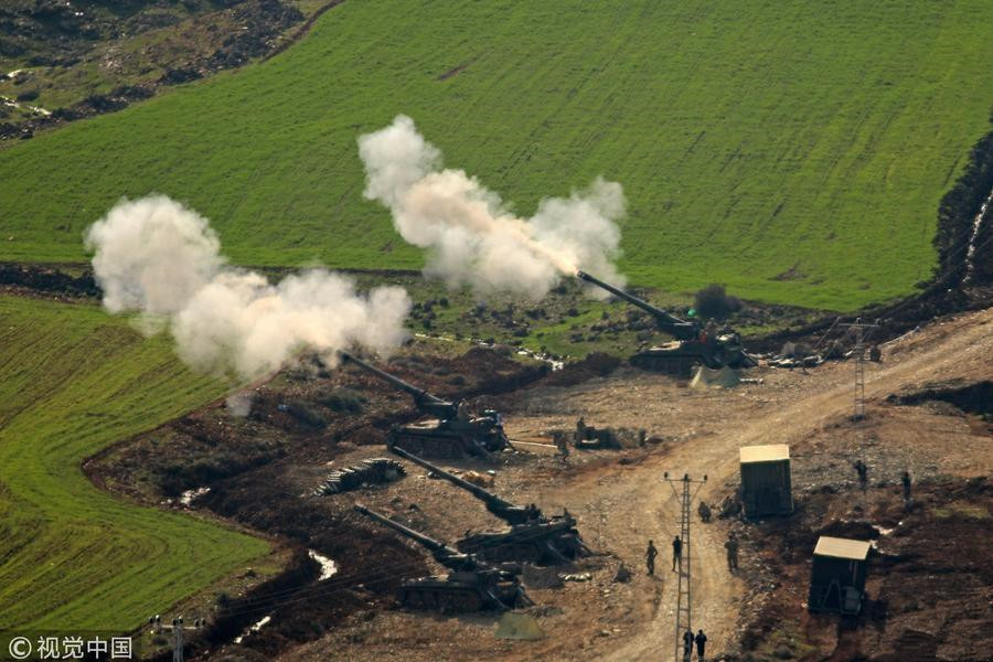 当地时间2018年2月2日,土耳其哈塔伊,土耳其军队持续打击叙利亚阿夫林库尔德武装。