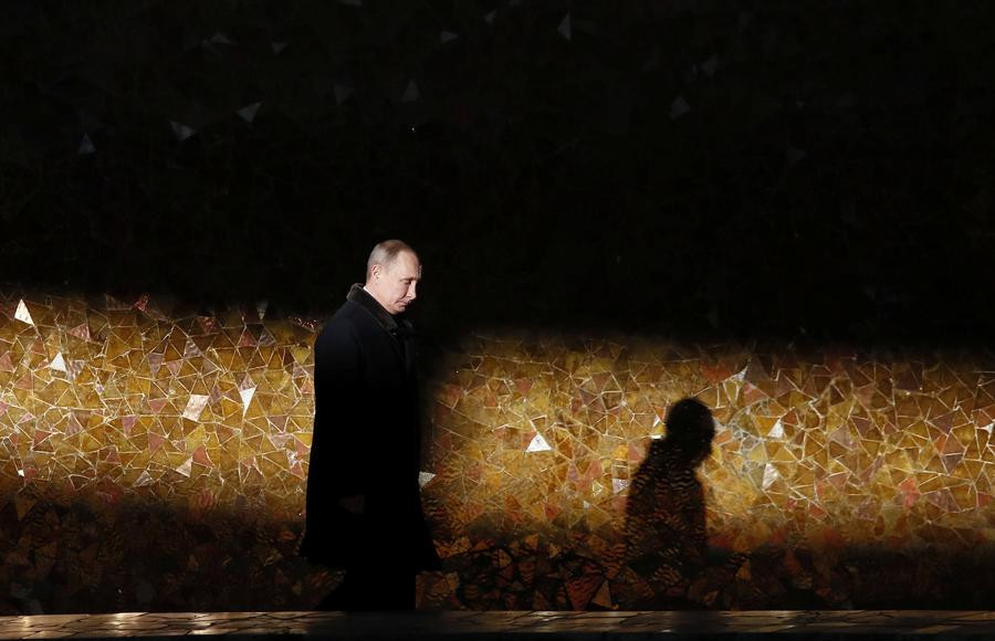 当地时间2018年2月2日,俄罗斯伏尔加格勒,俄罗斯总统普京出席斯大林格勒战役75周年纪念活动,向马马耶夫岗纪念碑献花。