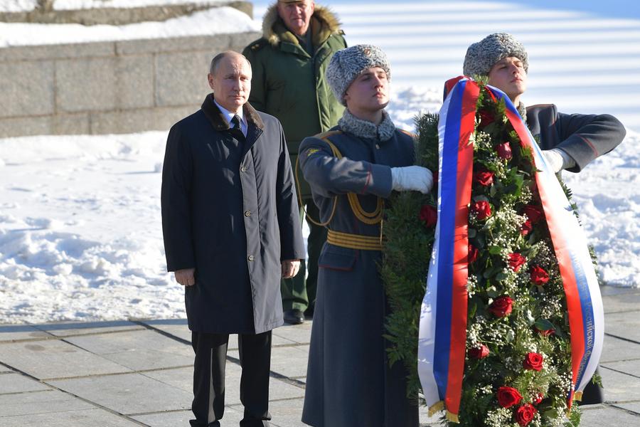 当地时间2018年2月2日,俄罗斯伏尔加格勒,俄罗斯总统普京出席斯大林格勒战役75周年纪念活动,向马马耶夫岗纪念碑献花。
