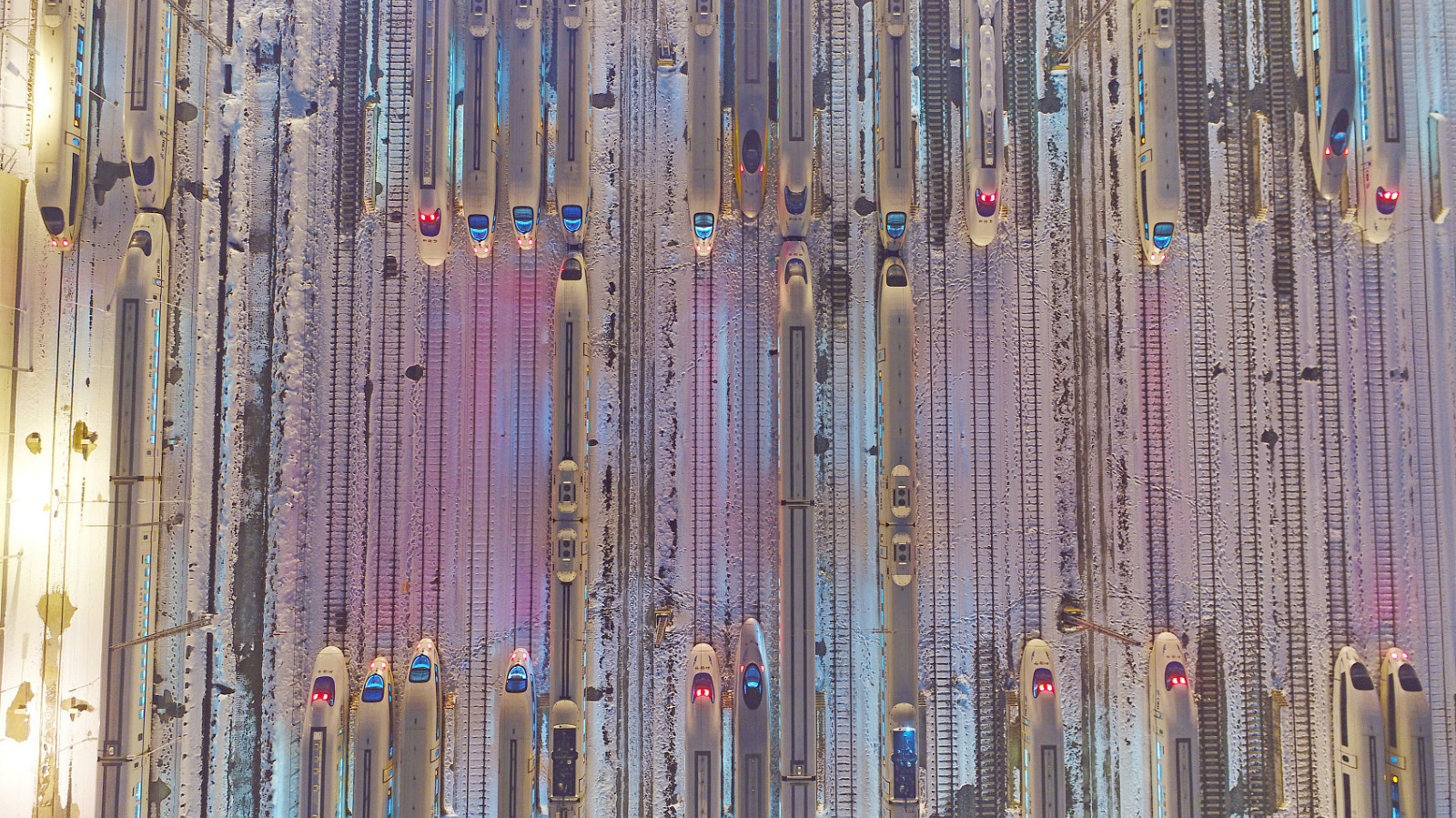 2018年1月31日,安徽合肥,合肥南动车运用所里春运动车组犹如万箭齐发,待命出征。