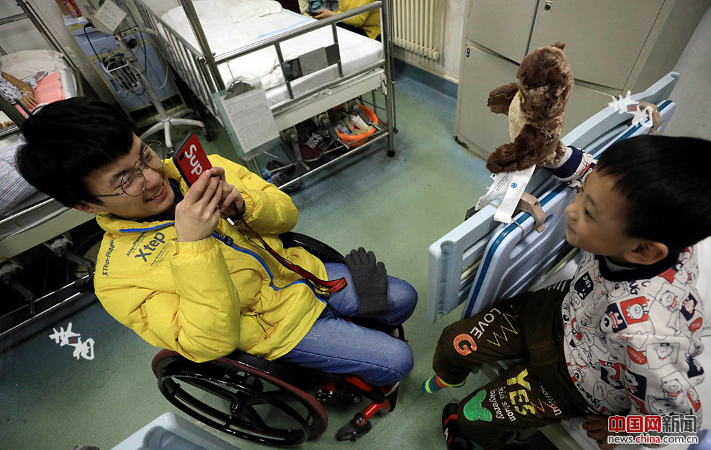 在赵浩洋6岁那年的冬天,他意外摔倒,淤血压迫脊髓,导致双腿无法站立,只能与轮椅相伴。图为在山东省立医院儿童骨科病房,赵浩洋与“瓷娃娃”患者一起交流。