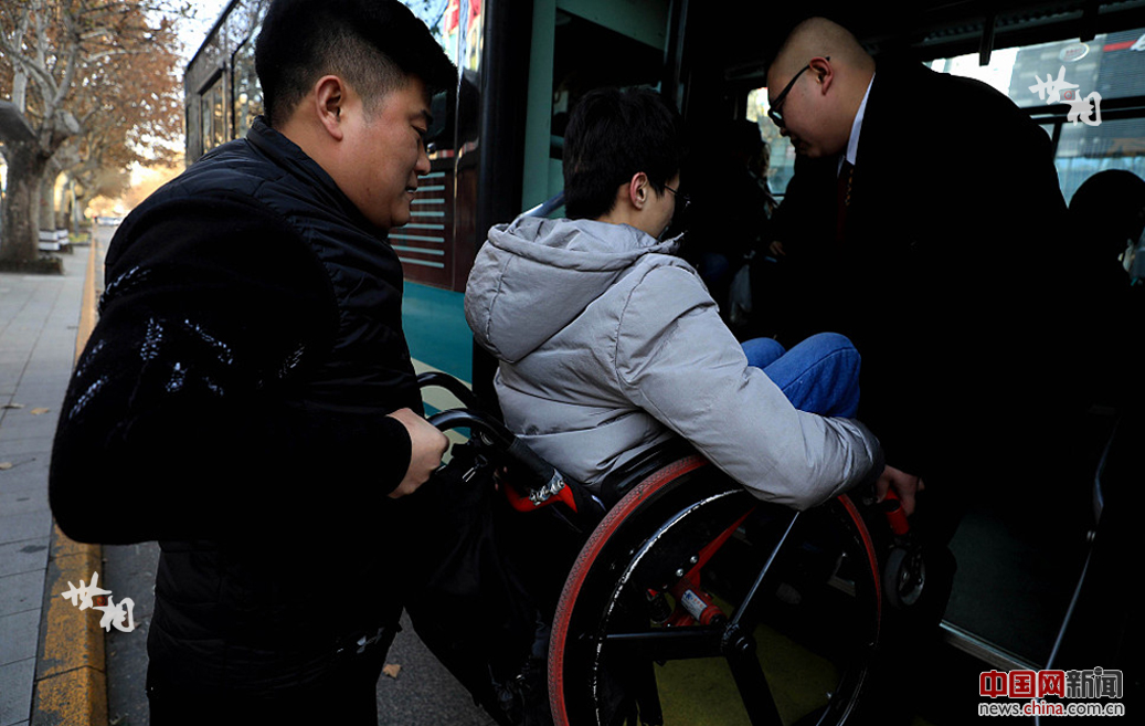 赵浩洋在这里主要负责联络医院、为外地患者取药、探视患者及残疾人就业等相关工作。入职3个月来,他已帮助60多位残疾人找到了工作。图为 赵浩洋准备乘坐公交车,不少市民伸出援助之手。