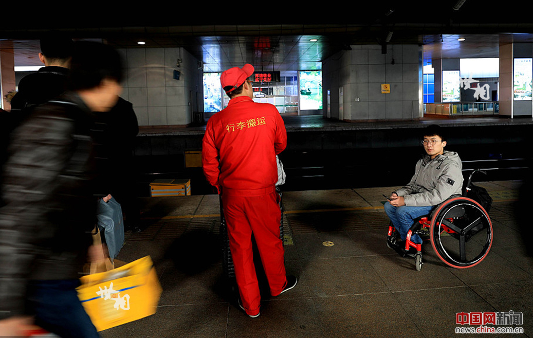 赵浩洋说,轮椅只是改变了他出行的方式,并没有束缚他的梦想。自己只有大方走出去,融入社会,才能体现“障健同行”的理念,才能更好推进社会无障碍设施的建设。图为赵浩洋在济南火车站候车。