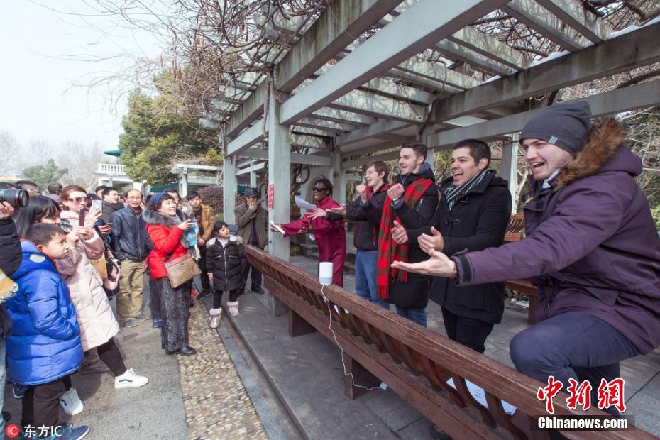 外国留学生洋腔洋调的诗歌朗诵吸引了不少路人注意,有路人主动上前矫正他们的口音。 图片来源:东方IC