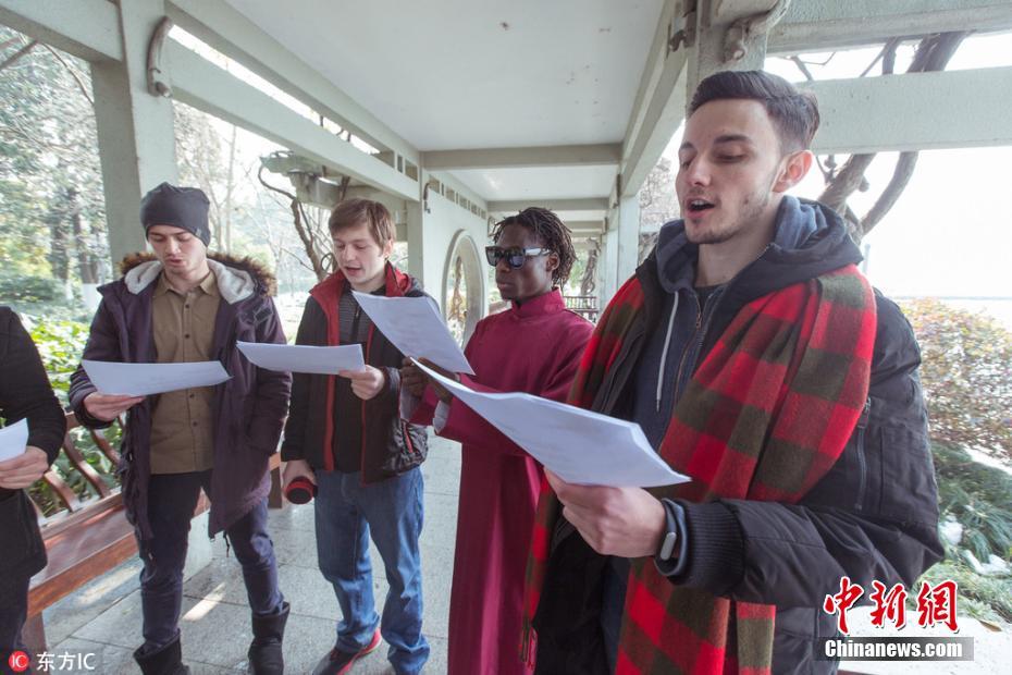 2018年2月2日,杭州西湖六公园,一群外国留学生洋腔洋调的诗歌朗诵吸引了不少路人注意。图片来源:东方IC