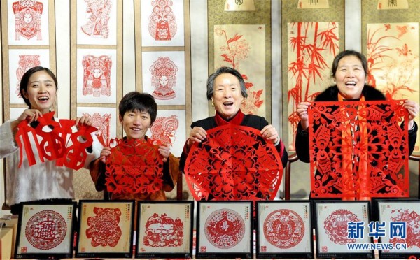 2月2日,在河北省黄骅市东常庄剪纸风情艺术小镇,“渤海渔村剪纸”非物质文化遗产代表性传承人韩宝菊(右二)和村民们在一同展示剪纸作品。