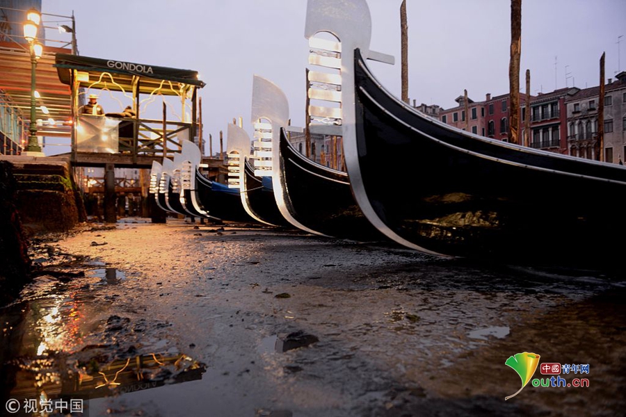 当地时间2018年1月30日、31日,意大利威尼斯,由于罕见“低潮”,“水城”威尼斯近日水位大幅下降,部分河道露出泥泞或只剩浅浅一些水的河床,许多标志性的平底船罩着篷布,搁浅在岸边。英国《每日邮报》网站2月1日报道,威尼斯部分河道水位下降了约58厘米,主要原因包括冬季寒冷的天气、“超级蓝血月亮”引发的落潮、降水少等。