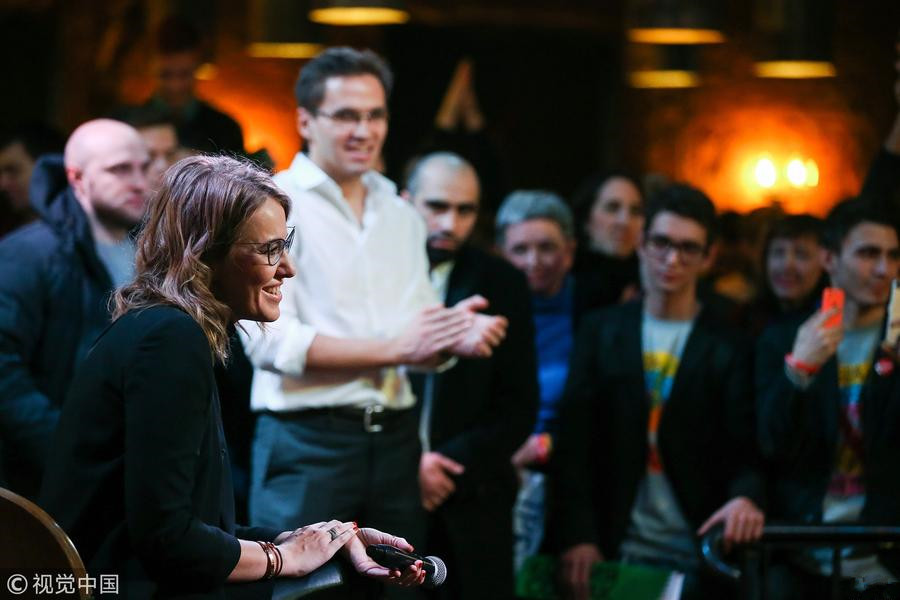 当地时间2018年2月3日,俄罗斯圣彼得堡,俄罗斯电视节目主持人、总统候选人克谢尼娅·索布恰克(Ksenia Sobchak)在餐厅会见支持者。