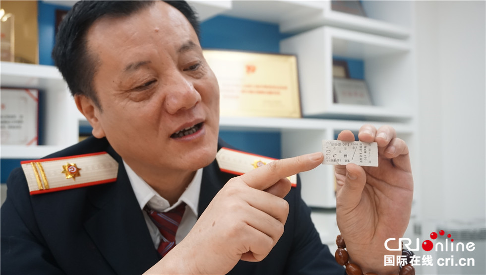 北京南站售票车间副主任康顺兴介绍80年代硬板车票。
