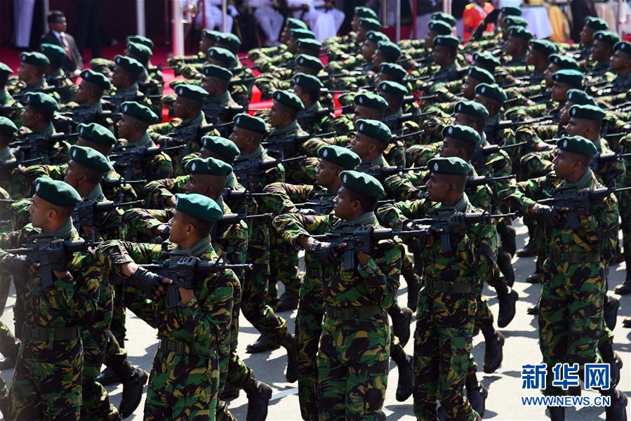 2月4日,在斯里兰卡科伦坡,军人参加阅兵式。斯里兰卡4日在科伦坡举行阅兵式,庆祝独立70周年。新华社发 普拉迪普·帕蒂拉纳 摄
