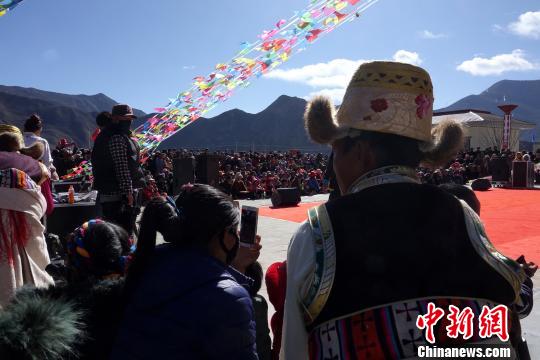 西藏山南市加查县冷达乡共康村村民观看演出。 孙翔 摄