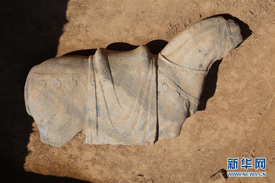 记者从陕西省考古研究院获悉,经过近一年的持续勘探发掘,唐代宗元陵取得唐陵大遗址保护项目的重要阶段性成果。考古工作者在唐代宗元陵发现的下宫1号建筑基址,是目前考古发现的保存最完整、面积最大的唐代陵园建筑基址,对研究、复原唐代的宫殿建筑具有重要意义。唐代宗元陵位于陕西省富平县庄里镇,依山为陵,气度非凡。图为唐代宗元陵的神道石马残块(资料照片)。 新华社发 陕西省考古研究院提供