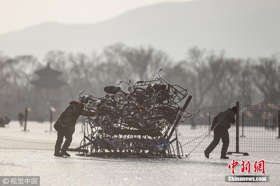 2月4日立春当天,所有公园的冰场全部关门谢客,2月5日起不再经营。紫竹院、陶然亭、玉渊潭等市属公园的室外雪场跨年开放,有望坚持到假期结束。图为颐和园冰场的管理人员收起滑冰用的器具。 风云 摄 文字来源:北京晨报 图片来源:视觉中国