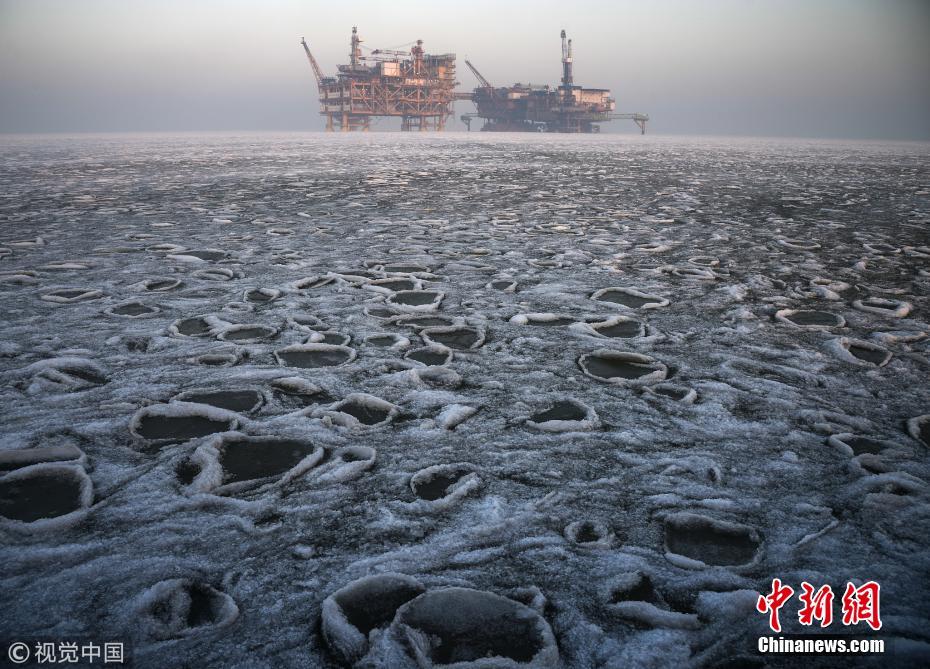 1月下旬,辽东湾海域的最低气温达到了零下20摄氏度,海面冰层的厚度达到了20至40厘米,锦州9-3油田就位于这里。作为中国海上地理位置最北、海油纬度最高的油气生产中心,每年12月至次年3月,油田都处于“冰川时代”。面对这样的特殊天气,有一个由近百名员工组成的“抗冰保产”冲锋队奋战在油田冰情“重灾区”,只为确保油田生产及油轮外输安全平稳运行。图为海冰在波浪的推挤之下互相撞击时产生了如荷叶形状的“荷叶冰”。 张磊 摄 图片来源:视觉中国