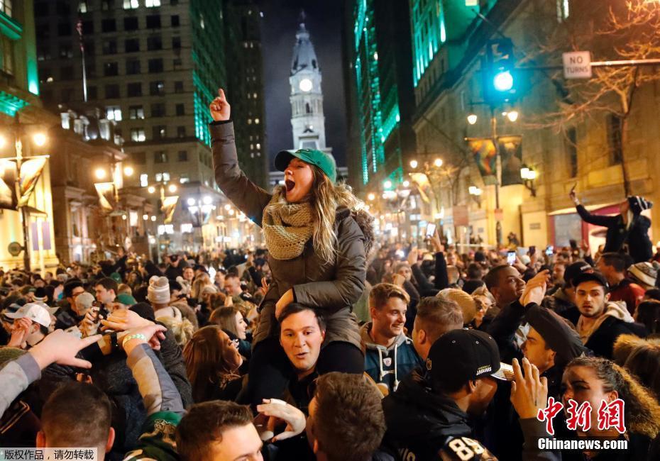在当地时间2月4日举行的美国“超级碗”总决赛中,费城老鹰队终结爱国者队的六连冠,成功捧起该队的首个“超级碗”。赛后,费城球迷涌上街头疯狂庆祝。报道称,兴奋的人群涌上南部的中央大街和中心城区,球迷扛起朋友,燃放烟花,敲响锅碗瓢盆。尽管警方已经事先在路灯等杆子上涂油防止攀爬,却没能阻止球迷“登顶”。