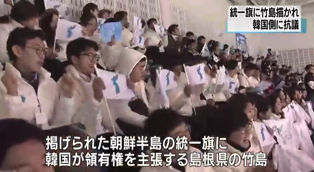 观众挥舞绘有“独岛”的朝鲜半岛旗