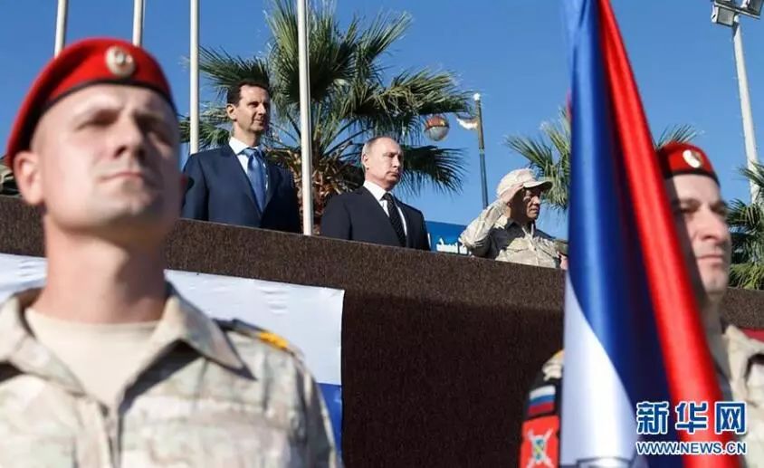 ▲资料图片:2017年12月11日,俄罗斯总统普京和叙利亚总统巴沙尔在赫迈米姆空军基地一同检阅军队,并听取报告。
