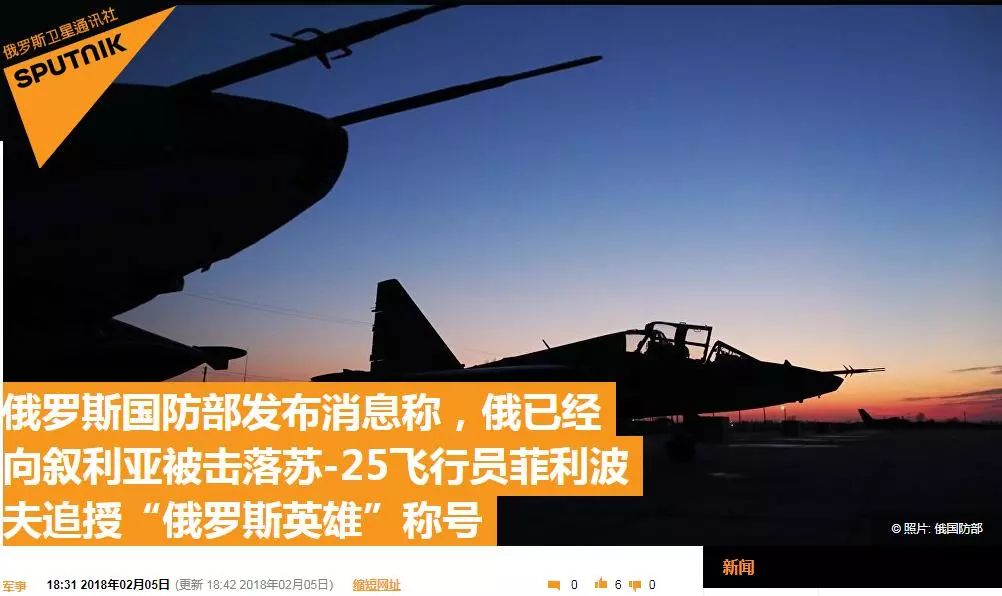 当地时间2月3日,叙利亚反对派称在叙西北部的伊德利卜省击落一架俄罗斯战机,并抓获了其飞行员。俄国防部随后发布通告称,一架苏-25战机3日在叙利亚伊德利卜省被击落,飞行员成功弹射,但在与恐怖分子战斗时牺牲。据称,飞行员曾报告自己在“征服阵线”武装分子控制的地区弹射出机舱。