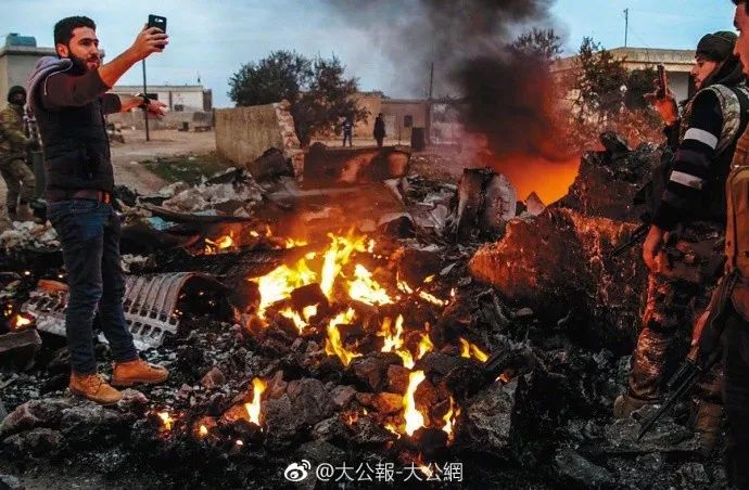 ▲战机坠落后,叙反对派赶到现场站在残骸旁自拍。(香港《大公报》微博)