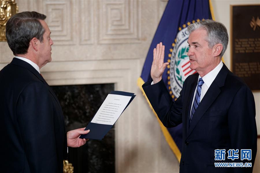 2月5日,杰罗姆·鲍威尔(右)在华盛顿宣誓就任新一届美国联邦储备委员会主席。 新华社发(沈霆 摄)