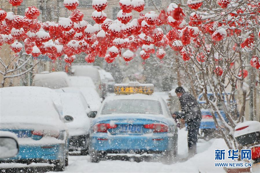 ​2月5日,在山东省烟台市新城南街,一名出租车司机在清理车上的积雪。当日,山东半岛迎来立春后首场降雪。 新华社发(唐克 摄)