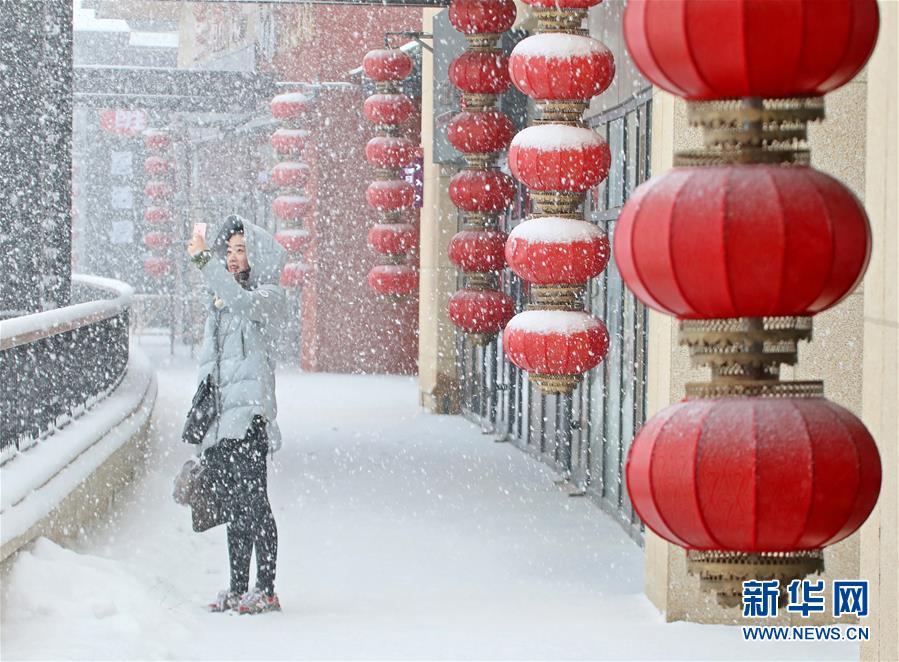 2月5日,一名市民在山东省烟台市上市里广场拍摄雪景。当日,山东半岛迎来立春后首场降雪。 新华社发(唐克 摄)