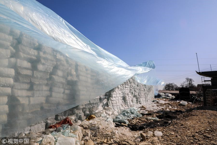 2018年2月3日,辽宁丹东。沿海采冰季进入尾声,最后的环节是给巨大的冰垛加隔温层。2月3日,前阳镇长川村一处冰场,采冰人将用一周的时间,给7万块超万吨的大冰垛盖上1100床大棉被,从而保证冰块在夏季也很难融化。