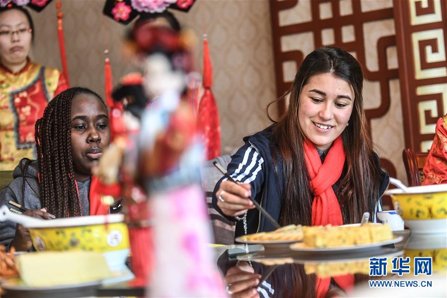 2月6日,塔吉克斯坦留学生莫贝贝(右)与肯尼亚留学生苏珊品尝满族特色饮食“八碟八碗”。新华社记者 潘昱龙 摄