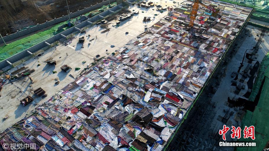 2月6日,在山东济南刘长山路南段一建筑工地,一新建房屋的顶层平台铺满了彩色的棉被,总数达到200多条,覆盖面积约2000多平方米。该建筑楼顶采用混凝土浇筑,为确保冬季低温下混凝土能够保证强度和防冻,捂盖棉被为混凝土保暖。目前虽然已经立春,但仍持续低温天气,市区最低气温达到了-9℃,丝毫没有春天的暖意。 御宁 摄 图片来源:视觉中国