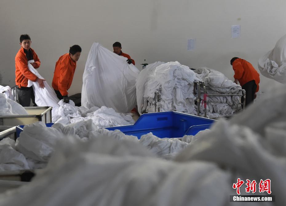 该车间负责人周宜霈告诉记者,平时洗涤量大概是3-5万件,最近春运旺季数量增加到约6万件左右,每件卧具在清洗时都是用氧漂液清洗,再通过160℃高温烫平机杀菌才能达到疾控中心相关要求,经过层层把关洗涤后的用品,广大旅客朋友可以放心使用。图为工人正在将洗好的用品进行分类。 周毅 摄