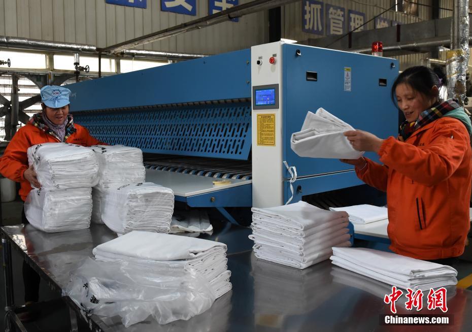工人将洗好的用品进行分类折叠打包。 周毅 摄