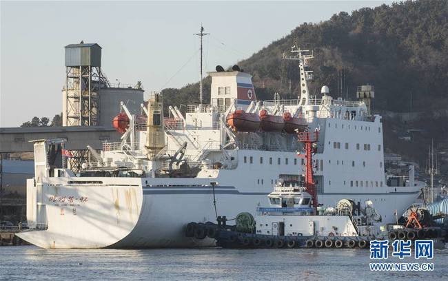 2月6日,朝鲜艺术团乘坐“万景峰92”号轮船抵达韩国江原道东海市墨湖港。 新华社发(李相浩摄)