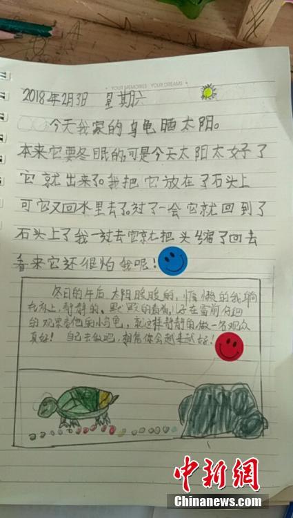 近日,河北保定市竞秀区前进小学的语文老师给一年级小学生布置写日记的寒假作业,没想到小朋友们“脑洞大开”地用图文结合的方式将立春节气、观月全食、过生日、游泳、打乒乓球、观察小动物等展现得妙趣横生。 文/霍瑾 张馨文 供图