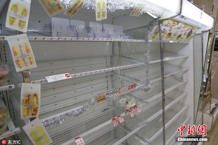 当地时间2018年2月7日,日本福井市,便利店被买空的货架。连日暴雪致1500辆汽车受阻,货物无法被送达。图片来源:东方IC