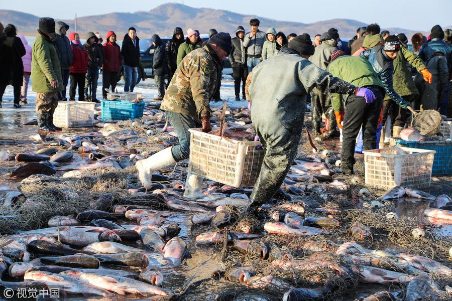 2018年2月4日,辽宁丹东。东北大部分地区的冬捕已经告一段落,而辽东南一些库区的冬捕才刚刚进入高潮。