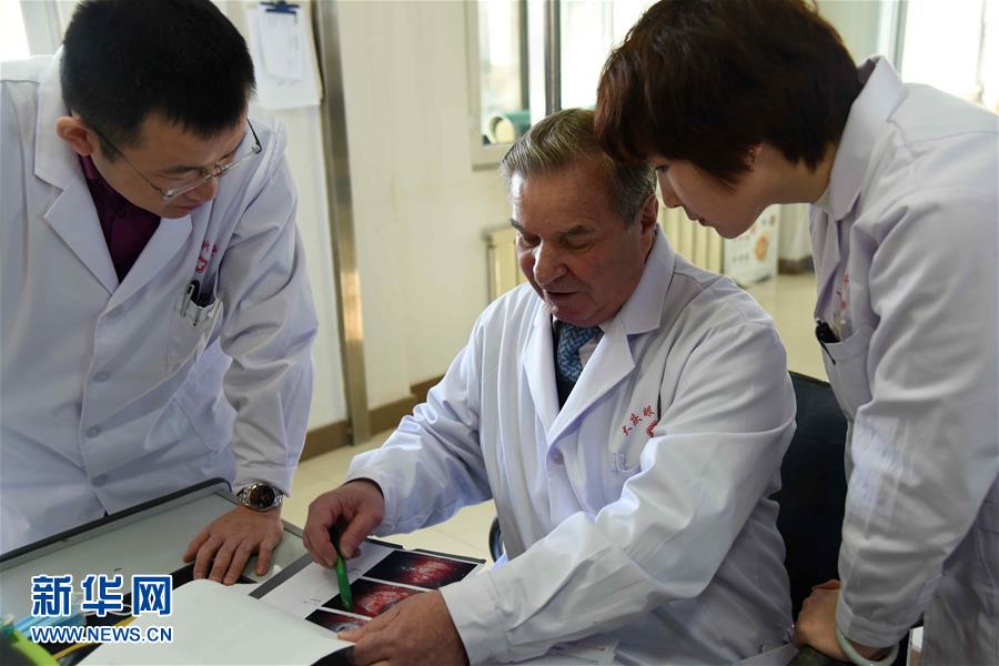 杜申与同事探讨疑难病例。“老杜”是大庆眼科医院同事对他的亲切称呼。本名杜申·尼古拉·瓦西里耶维奇的老杜退休前,是俄罗斯人民友谊大学眼科教研室一名优秀的眼科专家。中国东北“油城”大庆与俄罗斯首都莫斯科相隔甚远,但在来此行医超过10年的老杜看来,遥远的距离和陌生的环境并不成问题。老杜在退休前就与中国医院有交流合作,与中国医生结下了很深的友谊,这也直接促成他选择到中国工作。新华社记者 曹霁阳 摄