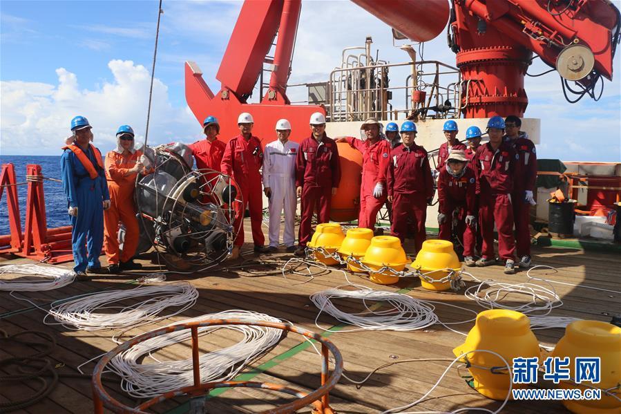 科考队员在本航次成功建成我国首个深海实时科学观测网,西太平洋深海3000米范围内的温度、盐度和洋流等数据实现1小时1次实时传输。新华社发