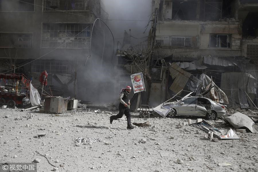 叙利亚东古塔区遭空袭 居民仓皇逃生