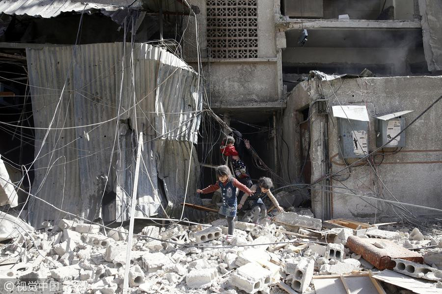 叙利亚东古塔区遭空袭 居民仓皇逃生